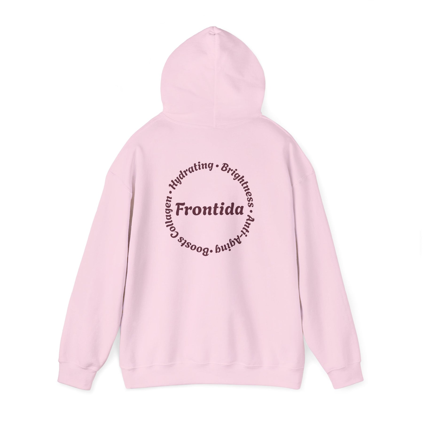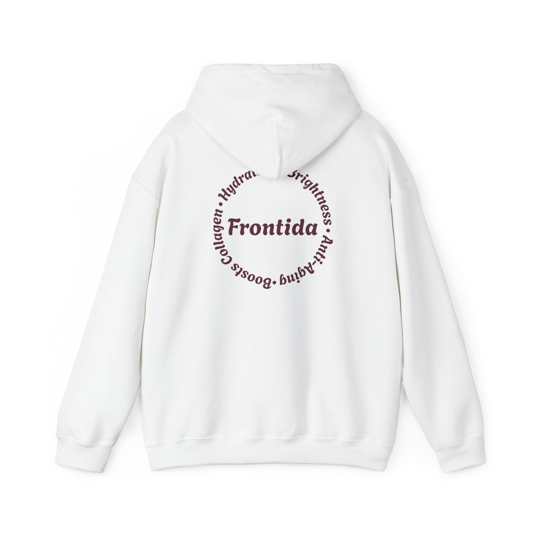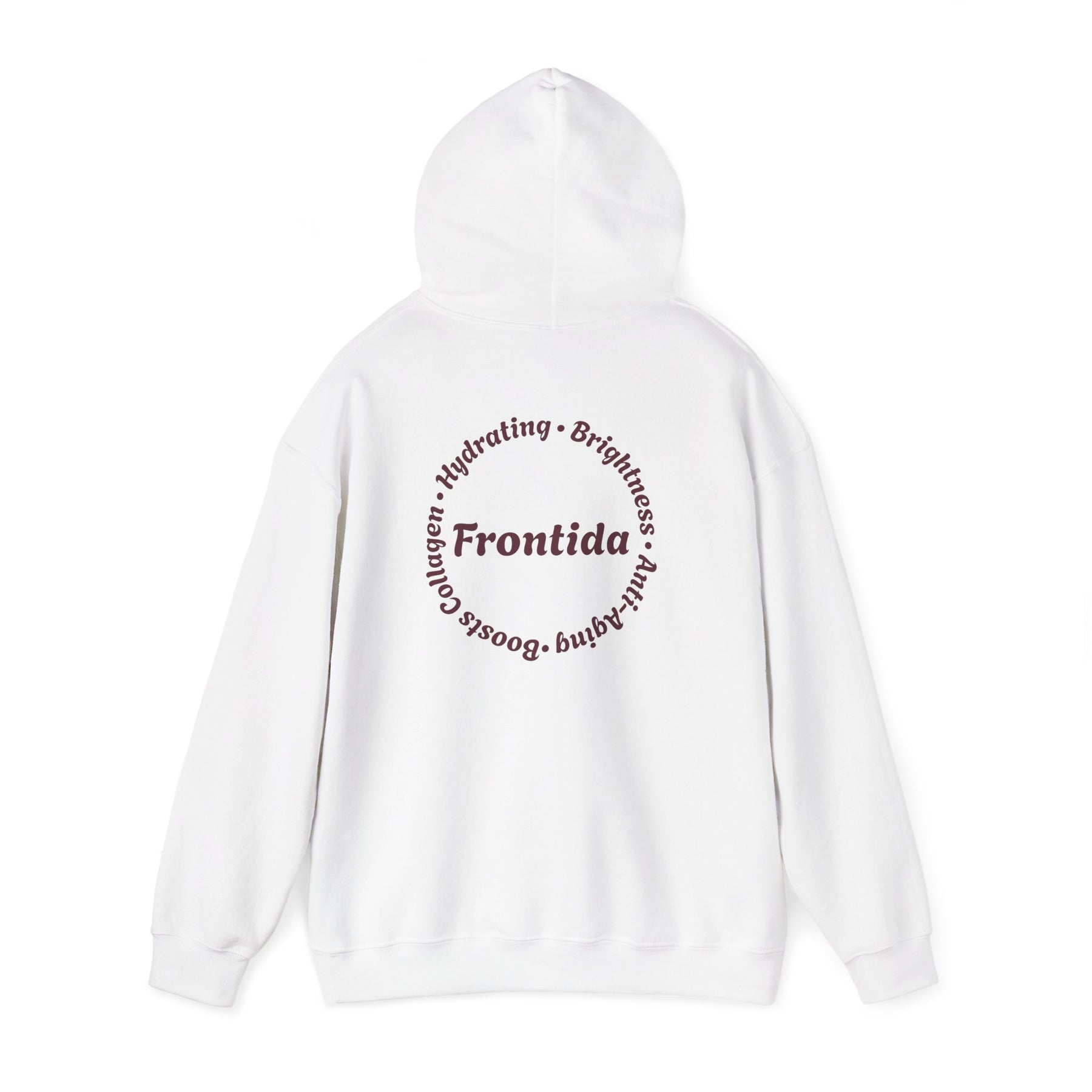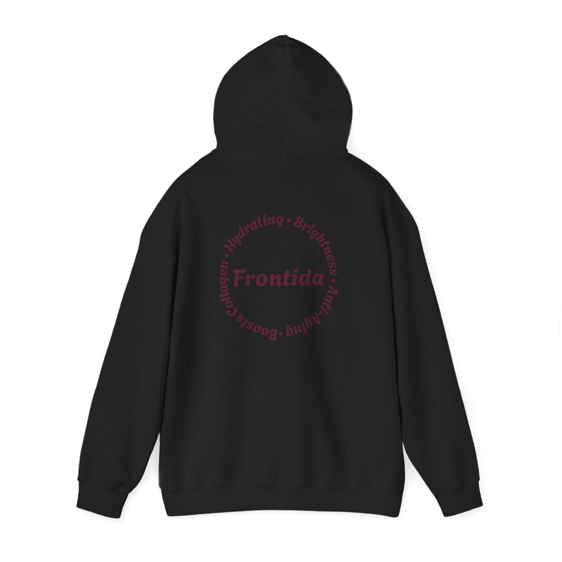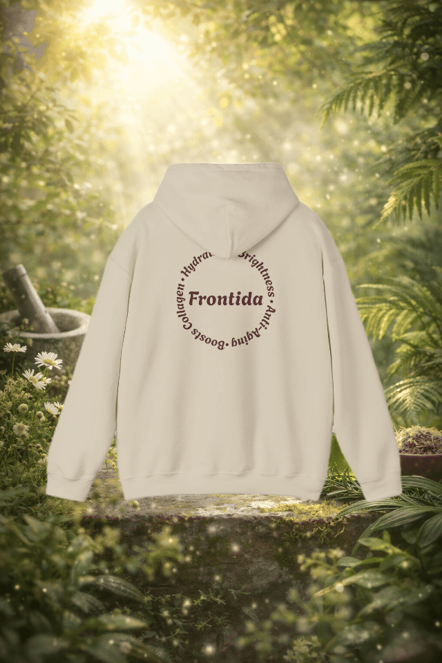This hoodie is designed to feel like a signature piece—comfortable, expressive, and grounded in thoughtful detail. The front showcases a bold Frontida winged emblem, centered around the branded capsule and framed by ornate florals, giving the design a sense of movement and strength without overpowering the look. On the back, a circular Frontida mark surrounded by words tied to self-care and renewal completes the story, making the hoodie feel intentional from every angle.