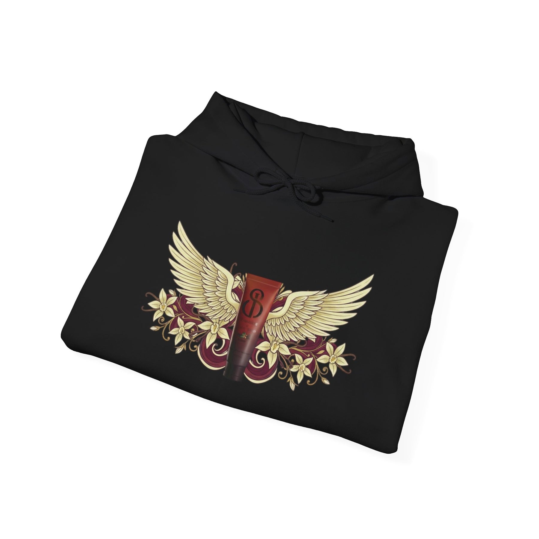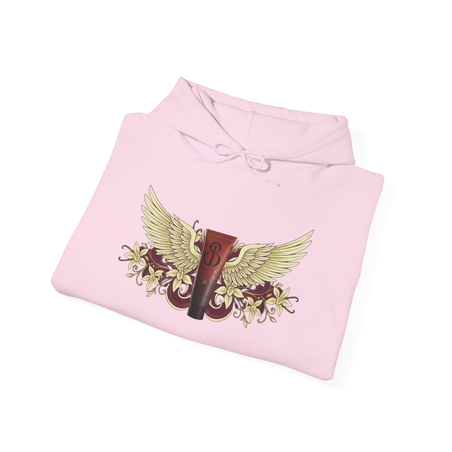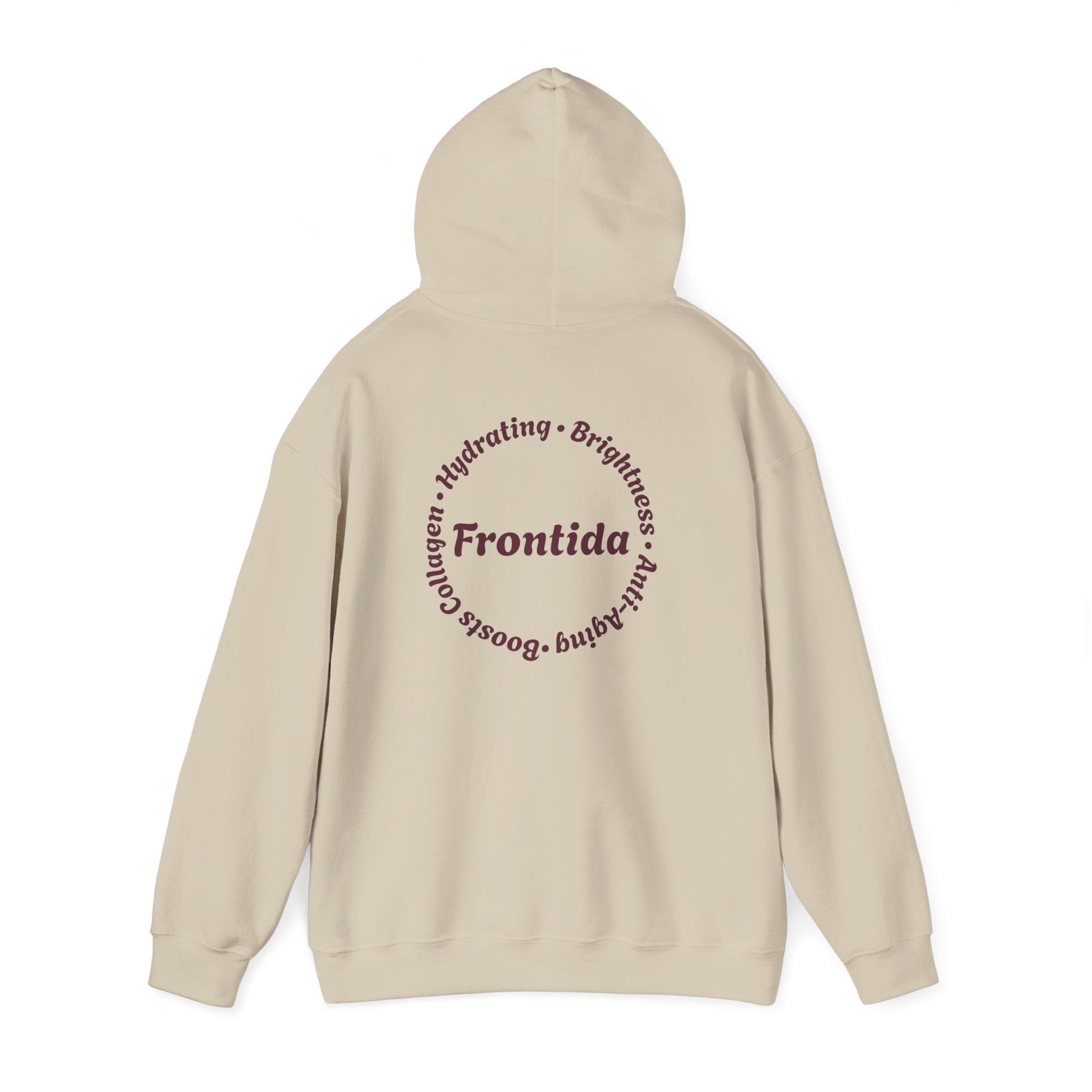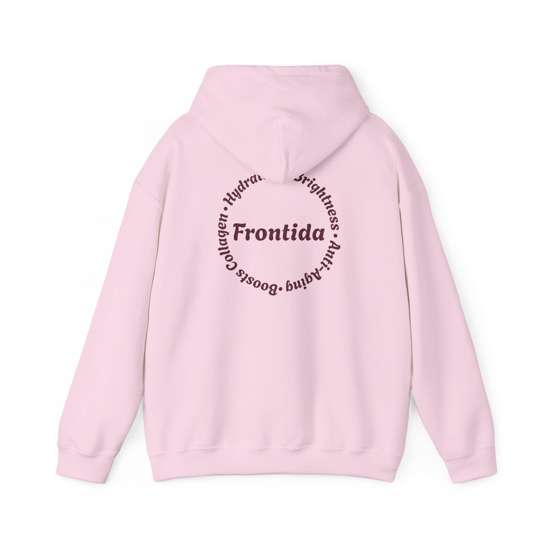 This hoodie is designed to feel like a signature piece—comfortable, expressive, and grounded in thoughtful detail. The front showcases a bold Frontida winged emblem, centered around the branded capsule and framed by ornate florals, giving the design a sense of movement and strength without overpowering the look. On the back, a circular Frontida mark surrounded by words tied to self-care and renewal completes the story, making the hoodie feel intentional from every angle.