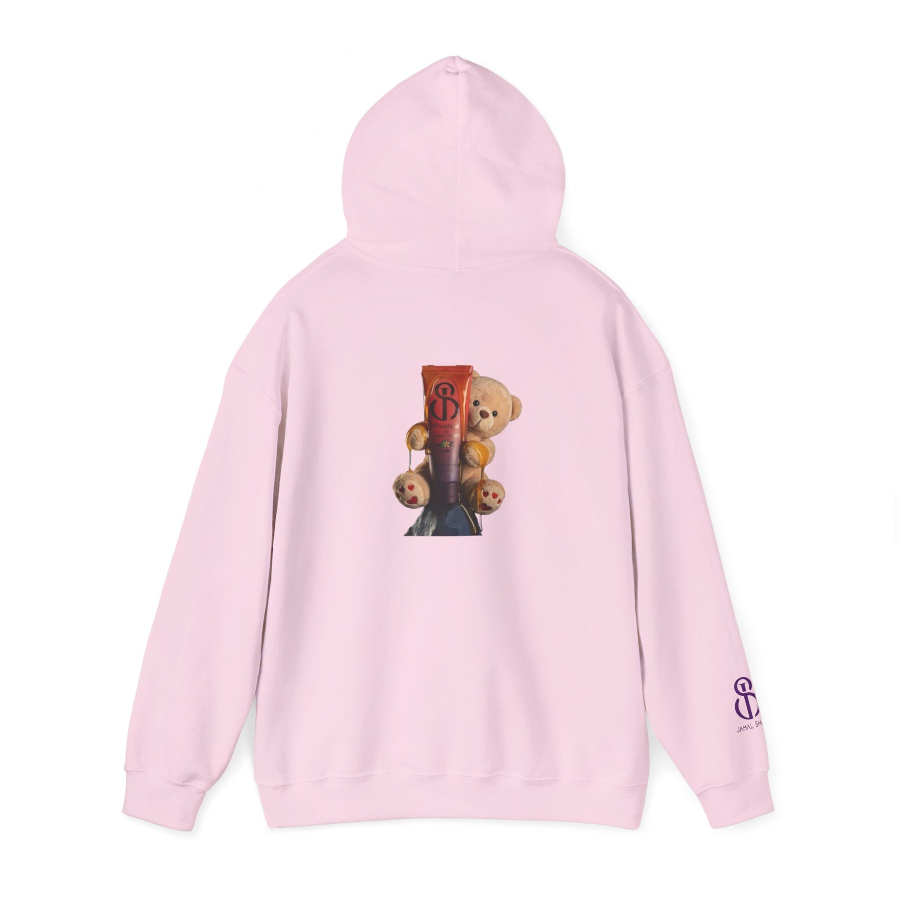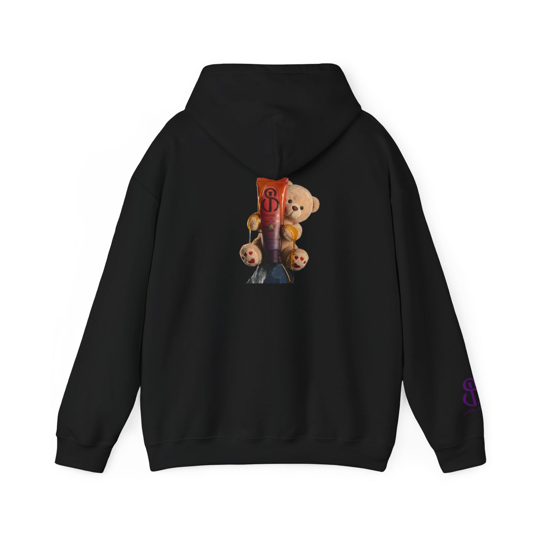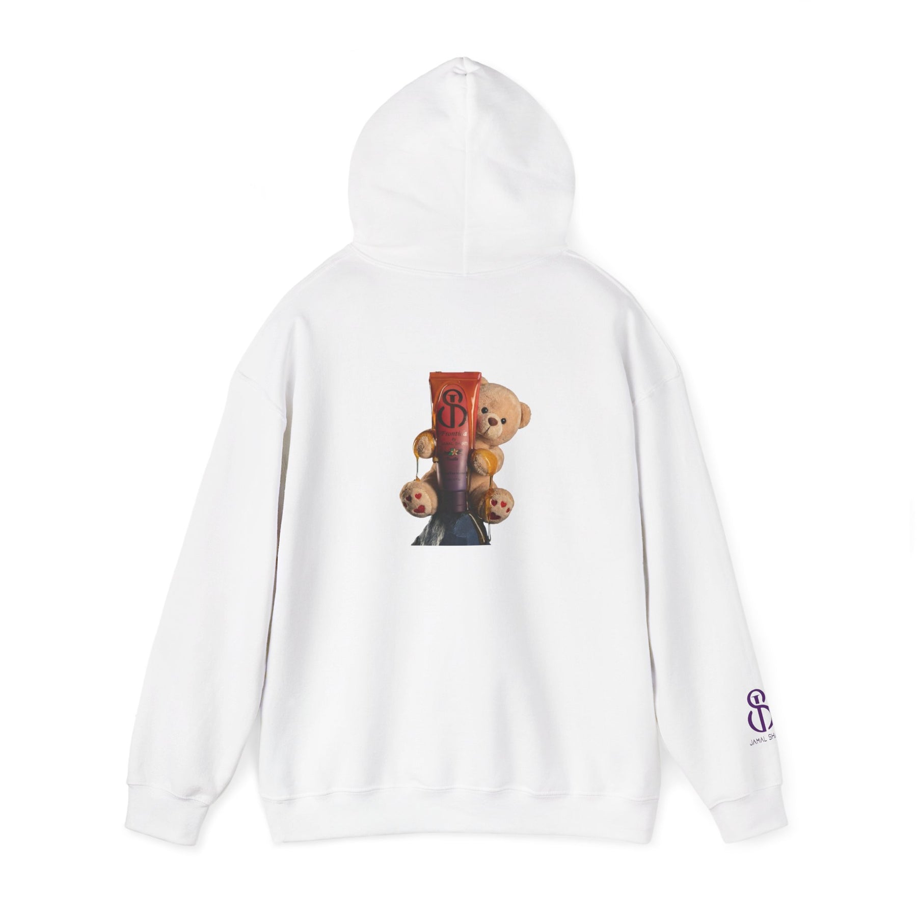 This hoodie is your everyday essential with a signature JS twist—cozy, durable, and designed to look clean from the front while making a statement from the back. The chest keeps it minimal with the JS monogram, and the sleeve adds an extra branded touch. Turn around and the vibe shifts: the teddy graphic featuring the JS-marked product tube brings playful personality that still feels premium and intentional.